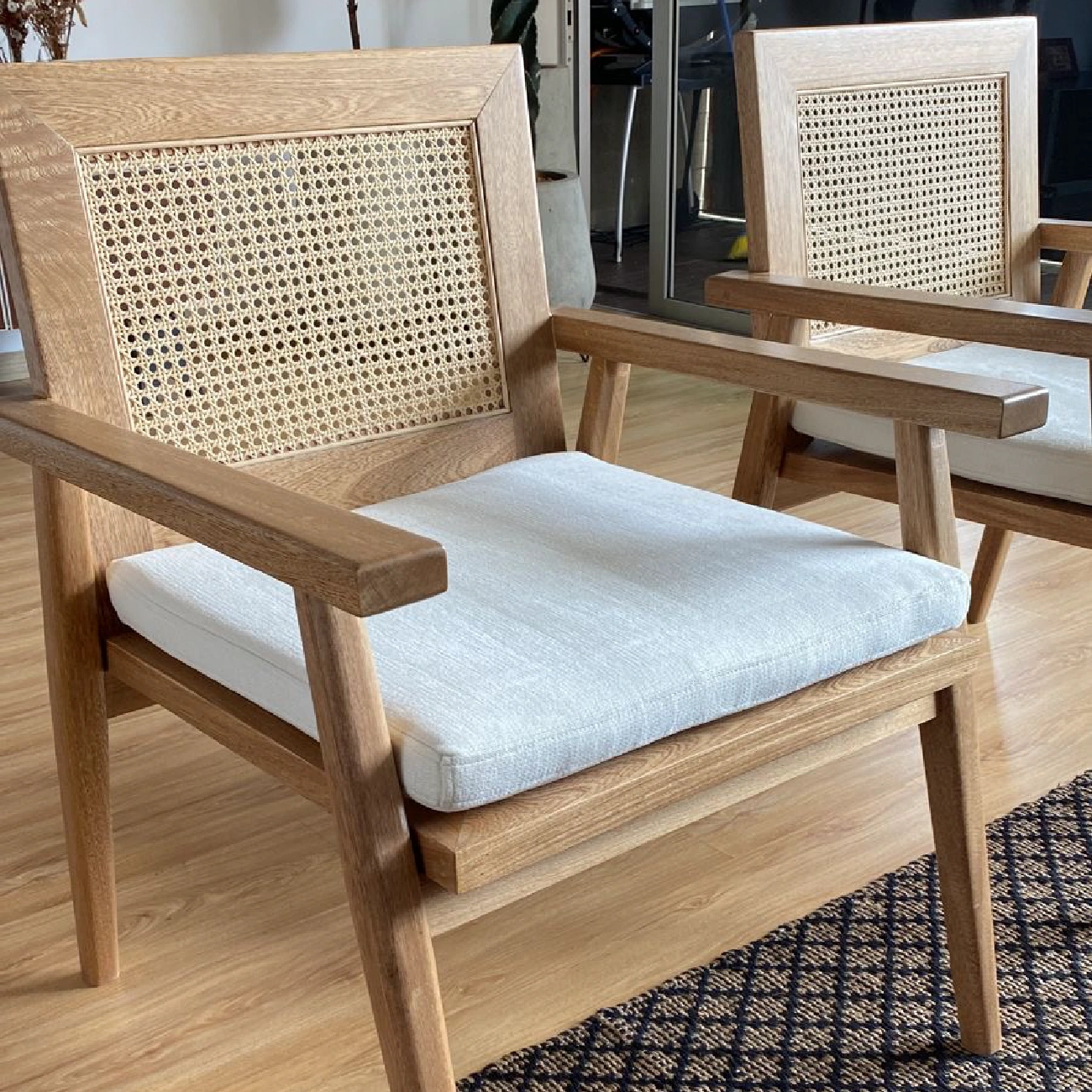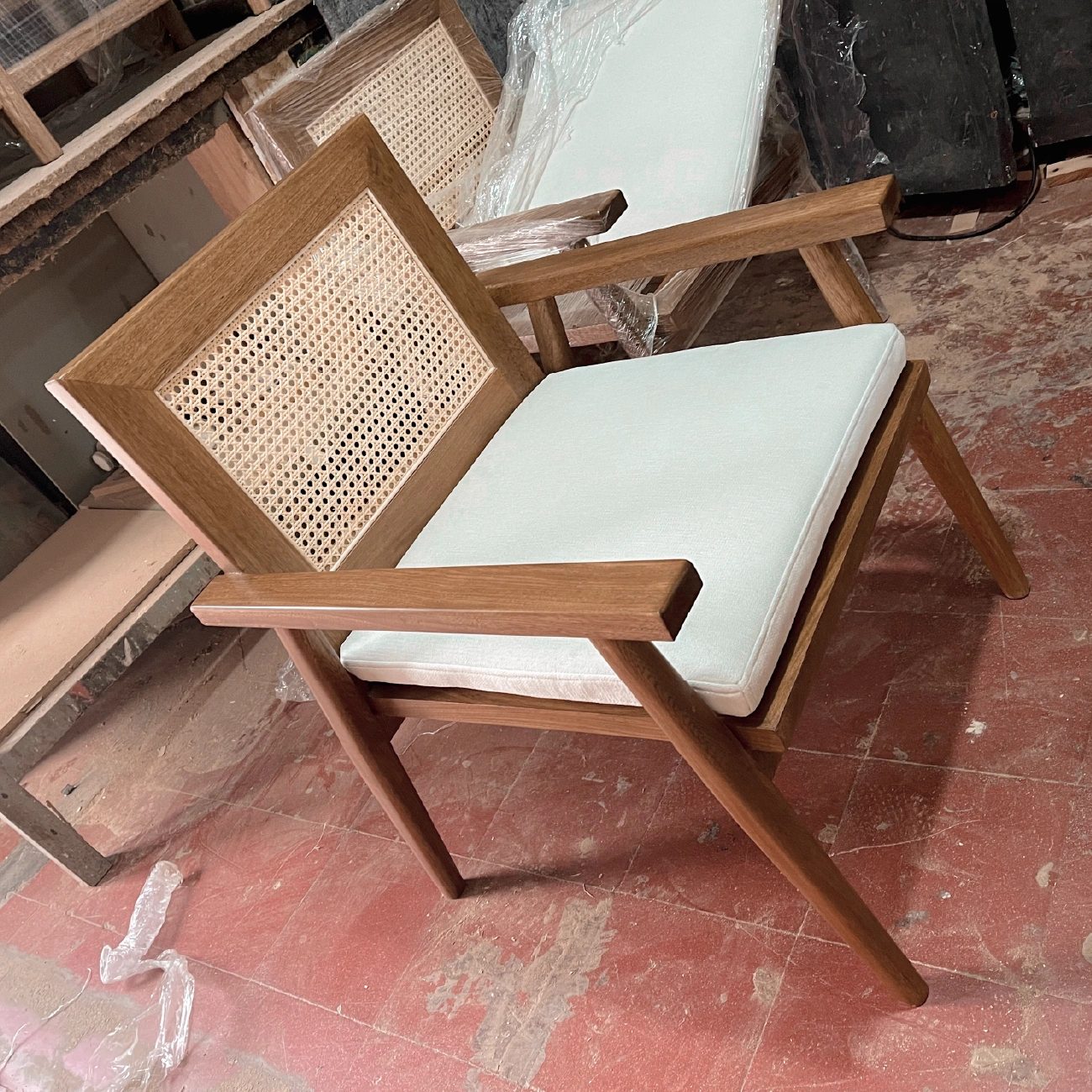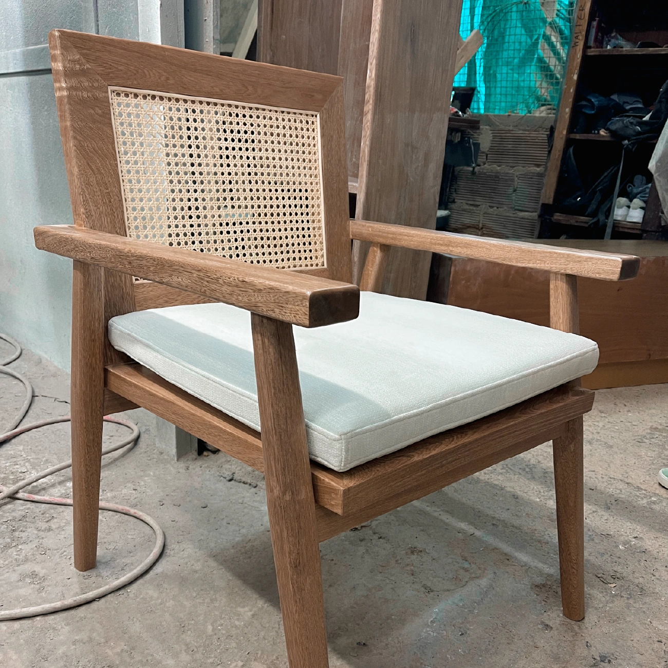 Poltrona Emmy fabricada artesanalmente en roble acabado semimate, incluye cojín de asiento. No incluye accesorios ni elementos decorativos.