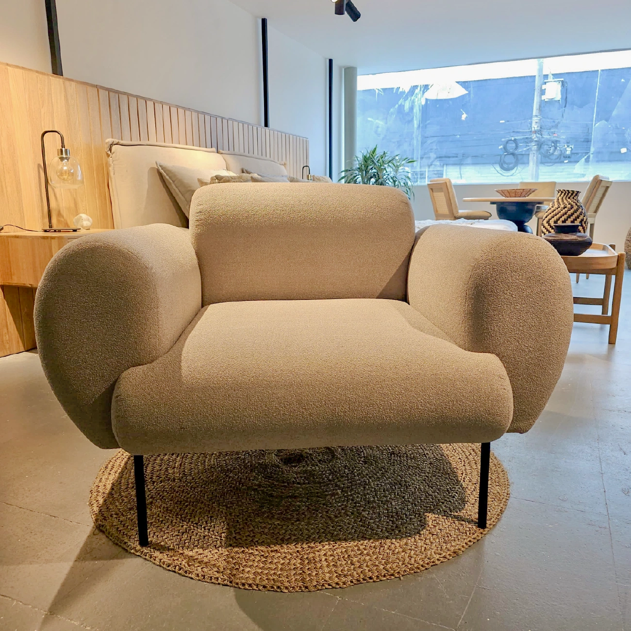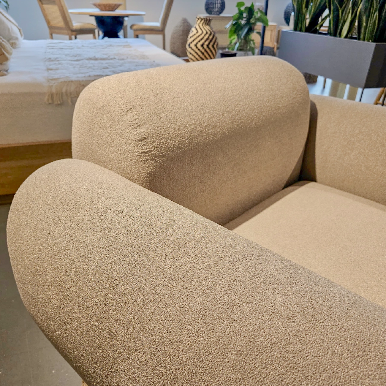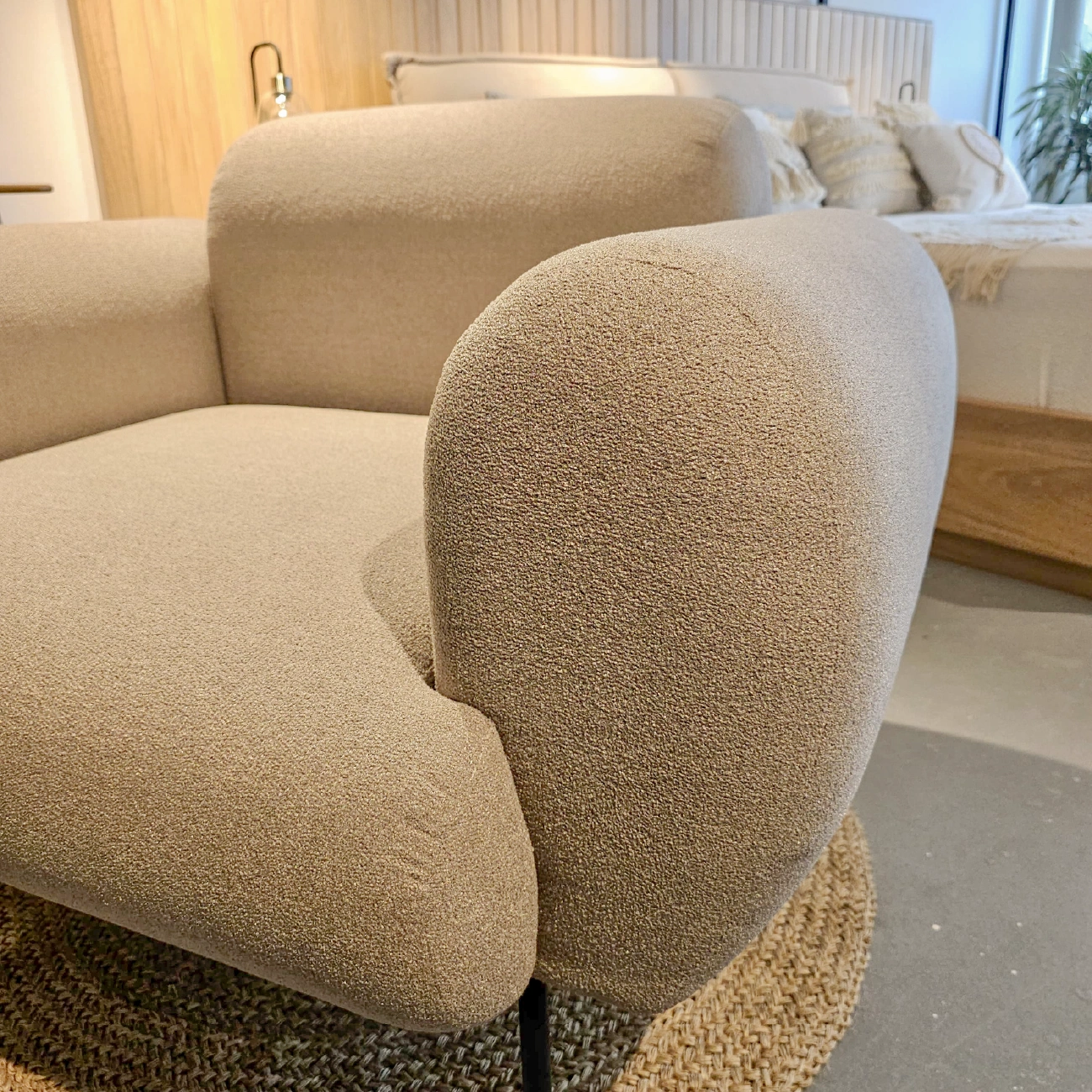 Poltrona Noa con estructura interna en cedro/triplex y espaldar en triplex, tapizada en el material de tu gusto. No incluye accesorios ni elementos decorativos.