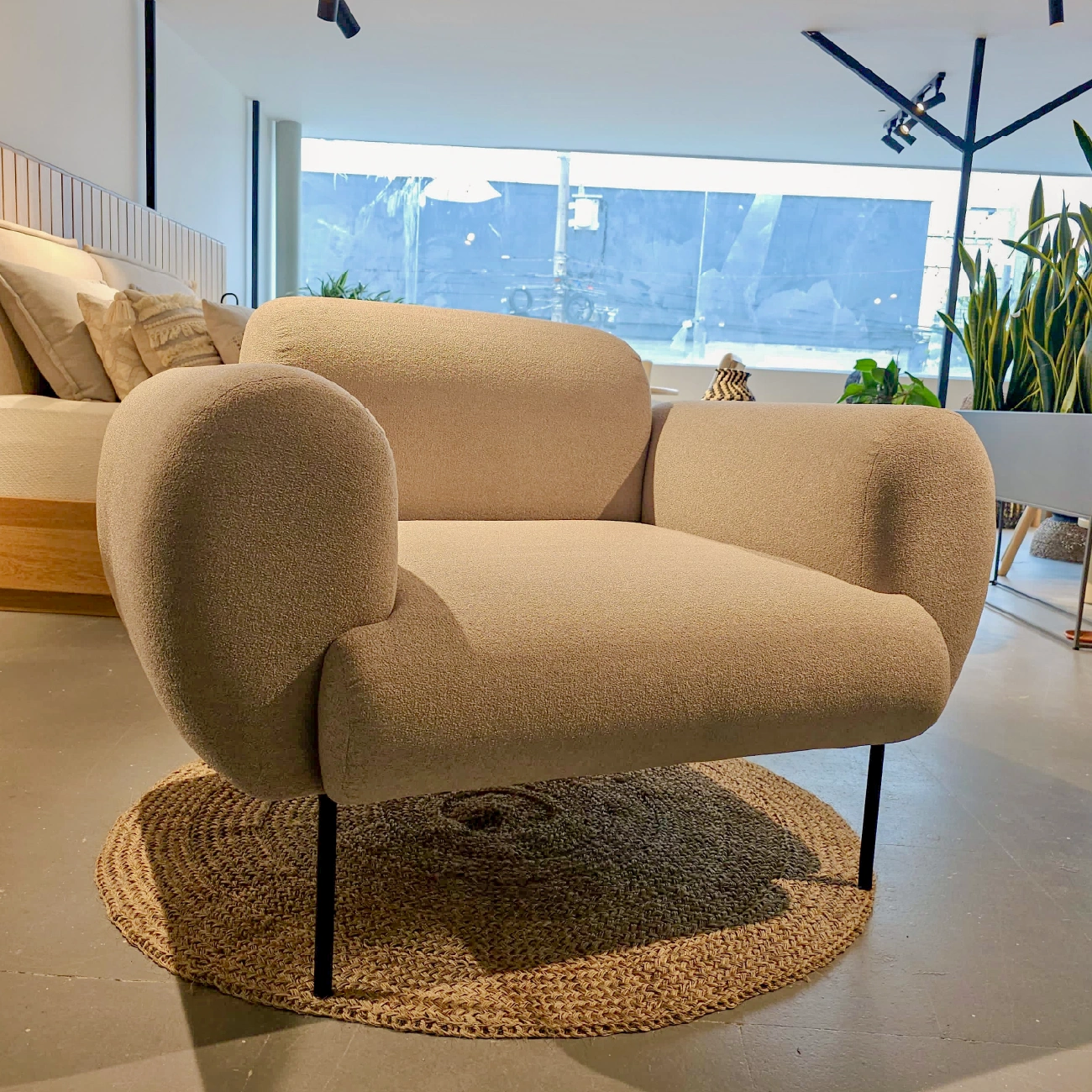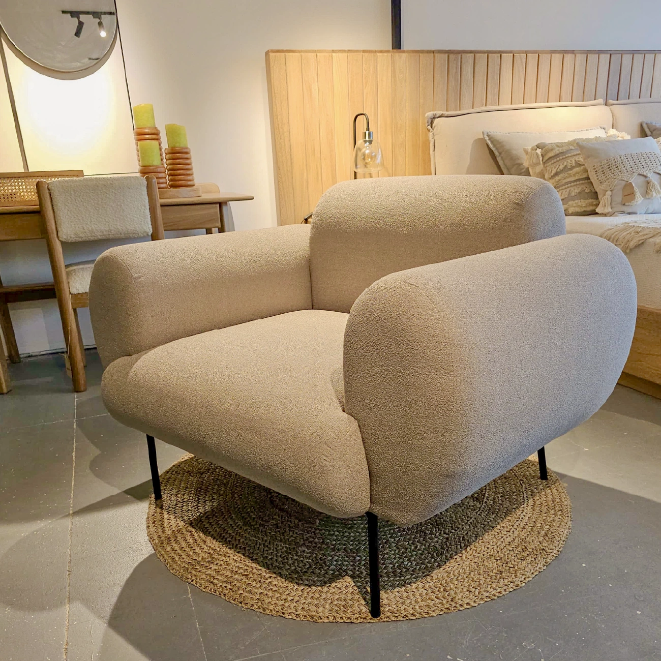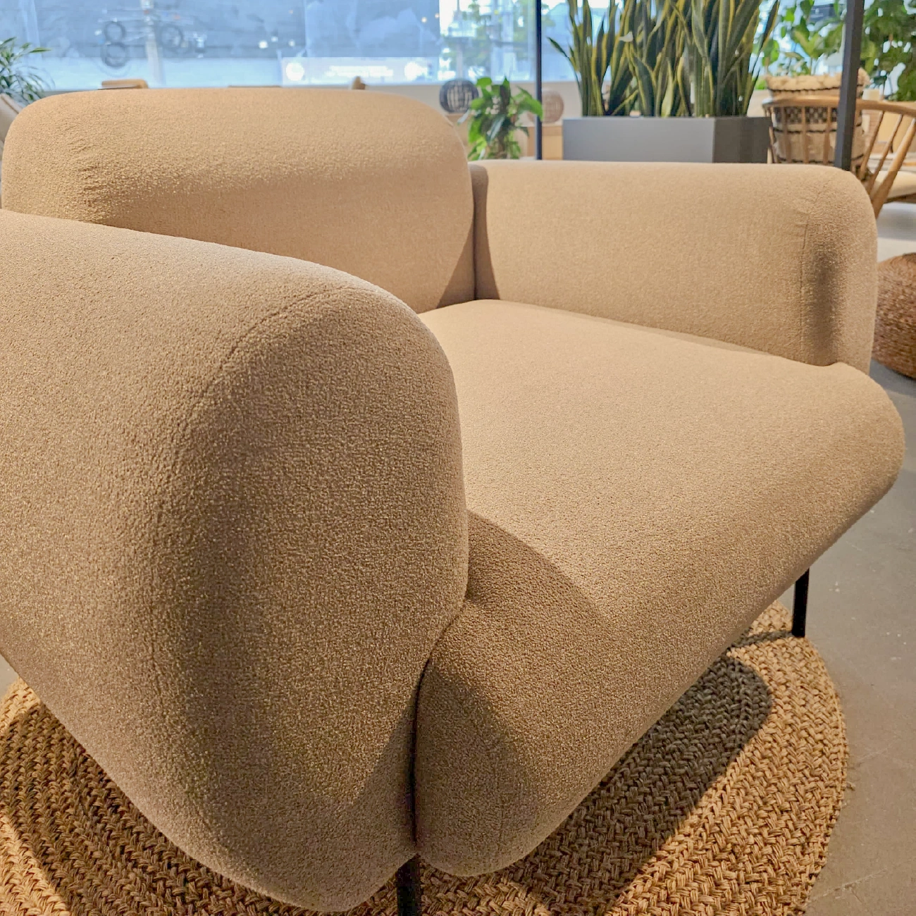 Poltrona Noa con estructura interna en cedro/triplex y espaldar en triplex, tapizada en el material de tu gusto. No incluye accesorios ni elementos decorativos.