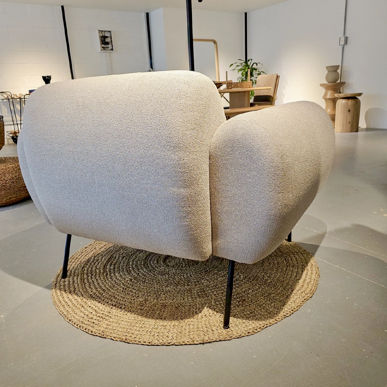 Poltrona Kaia fabricada en roble macizo con asiento y espaldar tejido en fibra natural (incluye cojín de asiento blanco). No incluye accesorios ni elementos decorativos