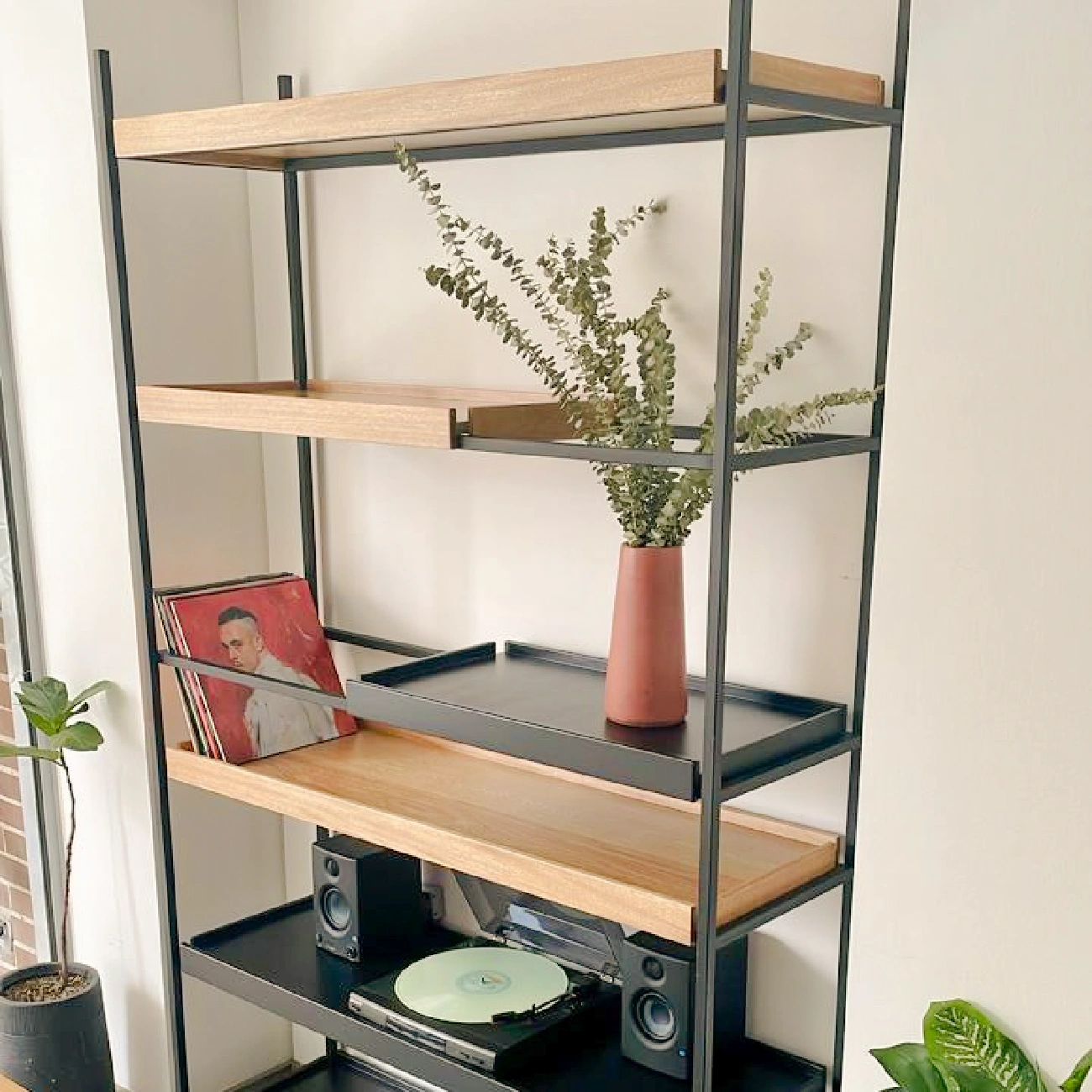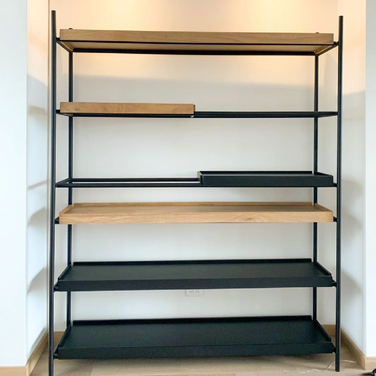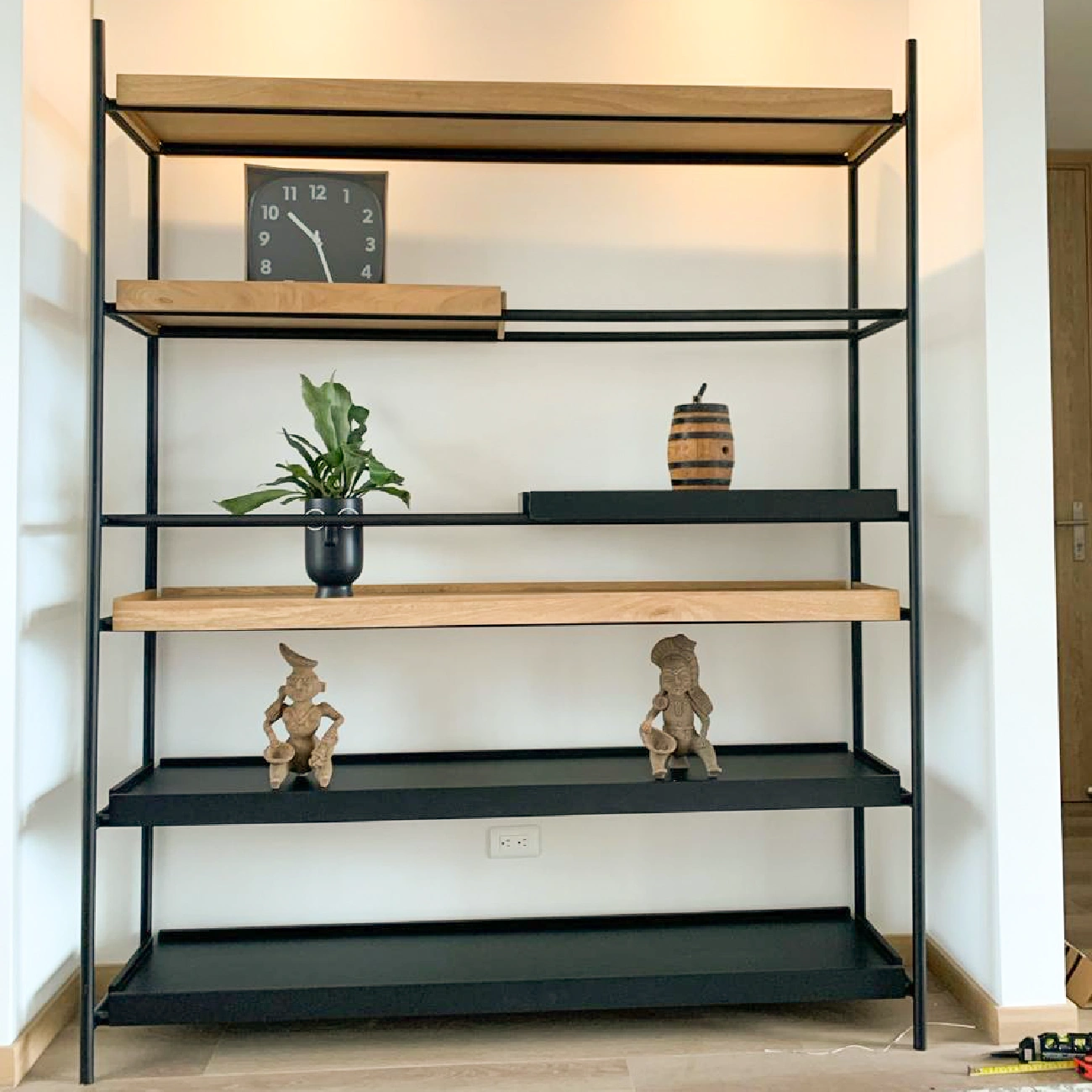 Repisa James fabricada artesanalmente con estructura en hierro con pintura negra electrostática, tablas en roble. No incluye accesorios ni elementos decorativos.